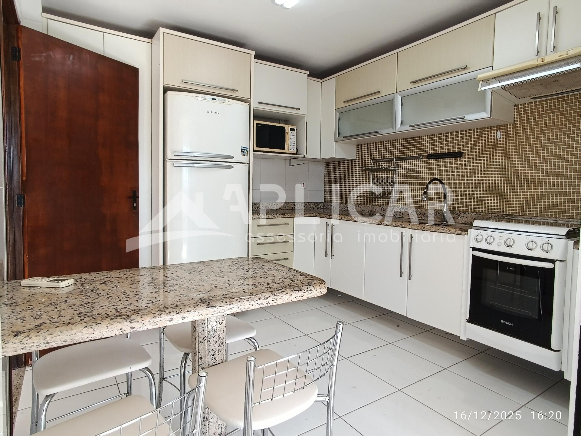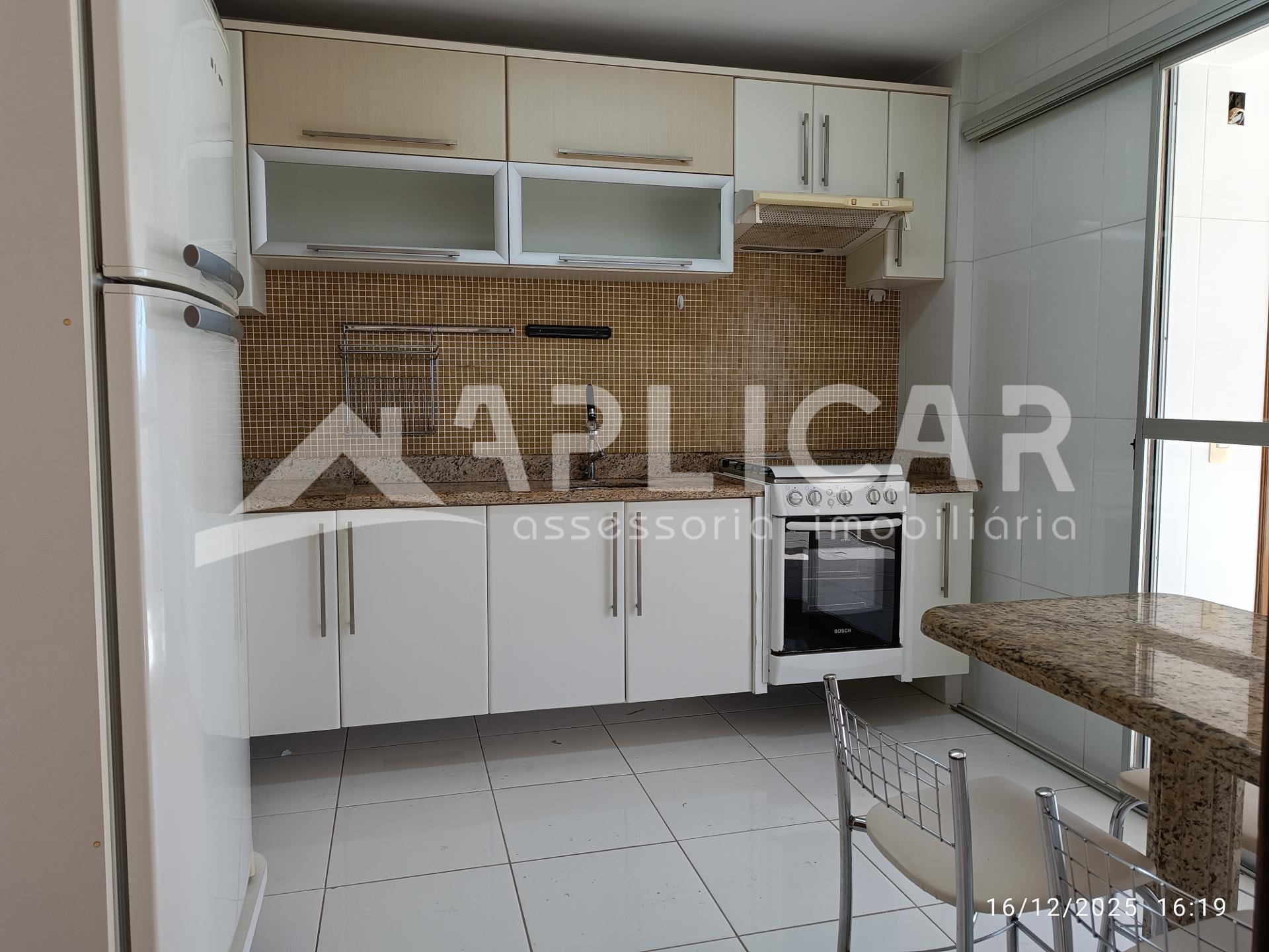 - Cozinha com armários planejados, fogão e geladeira